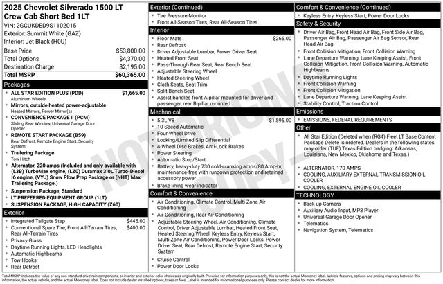 Summit White 2025 Chevrolet Silverado 1500 LT LT1 EcoTec3 5.3L V8 10-Speed Automatic 4WD10-Speed Automatic, 4WD, Black Cloth.Our team is dedicated to getting you the best price and all the information you need to make an informed decision! Any vehicles showing in our inventory are on our lot, not at another store miles away. We believe in transparent pricing and we do not charge dealer fees or add any additional surprise fees to our prices.Call Graff today at 989-684-4411 to confirm availability! Note: Internet prices are not compatible with other offers unless specified by dealer.